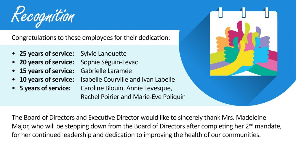 As we often say in our field of work, there is never a dull moment. This year was no exception. The election of a new government last June led to a major transformation. This is nothing new for the Centre de santé communautaire de l’Estrie (CSCE), as it has undergone many reforms since its creation in the early 1990s. For each of these reforms, our organization succeeded in better responding to the health care needs of francophones in Eastern Ontario. This new wave of transformation is creating opportunities and challenges that will once again be addressed by your Community Health Centre (CHC). It is with confidence and conviction that we will actively participate in this transformation to improve the programs and services provided to our communities.