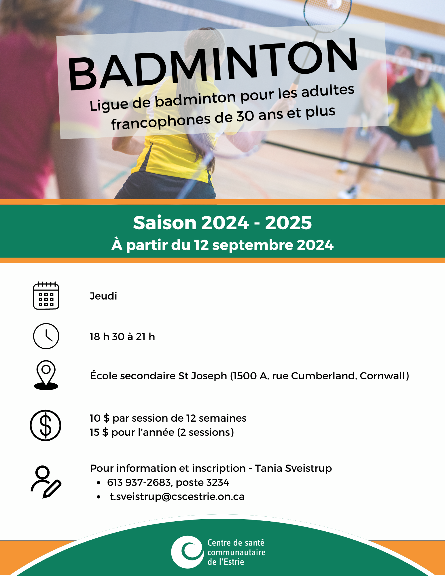 Ligue de badminton pour les adultes francophones de 30 ans et plus à Cornwall