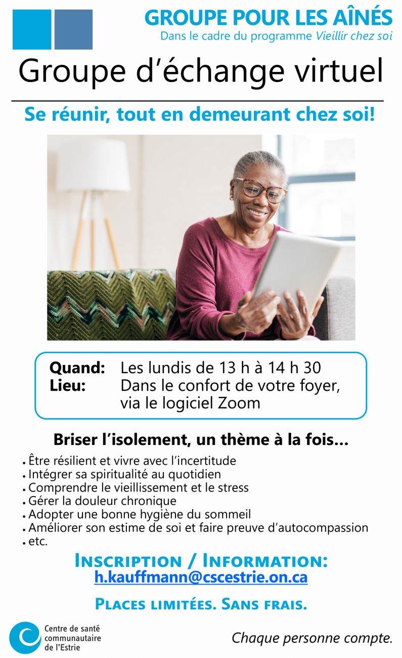 Groupe d’échange virtuel pour aînés offert tous les lundis de 13 h à 14 h 30.