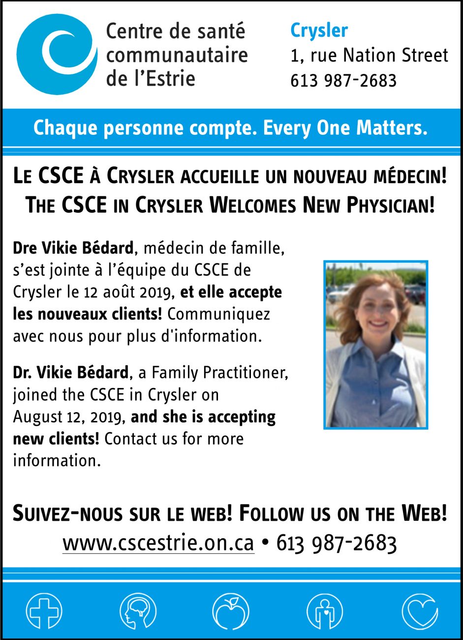 14 août 2019 – Dre Vikie Bédard, médecin de famille, s’est jointe à l’équipe du Centre de santé communautaire de l’Estrie (CSCE) de Crysler le 12 août 2019. Le CSCE est très heureux d’accueillir la Dre Bédard au sein de son équipe du 1, rue Nation, à Crysler.
