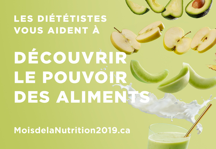 Pendant tout le mois de mars, en appui au Mois de la nutrition 2019, des diététistes parleront dans les communautés et les milieux de travail du pouvoir qu’ont les aliments d’améliorer la vie et la santé. Des trucs pour une vie saine, des recettes nutritives (et délicieuses) et des liens utiles sont accessibles à moisdelanutrition2019.ca.
