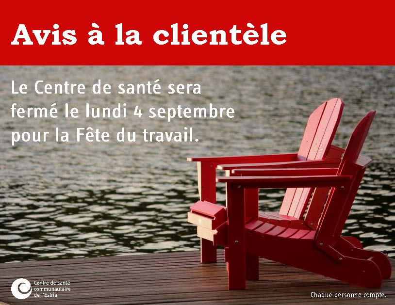 Veuillez noter que le Centre de santé sera fermé le lundi, 4 septembre.