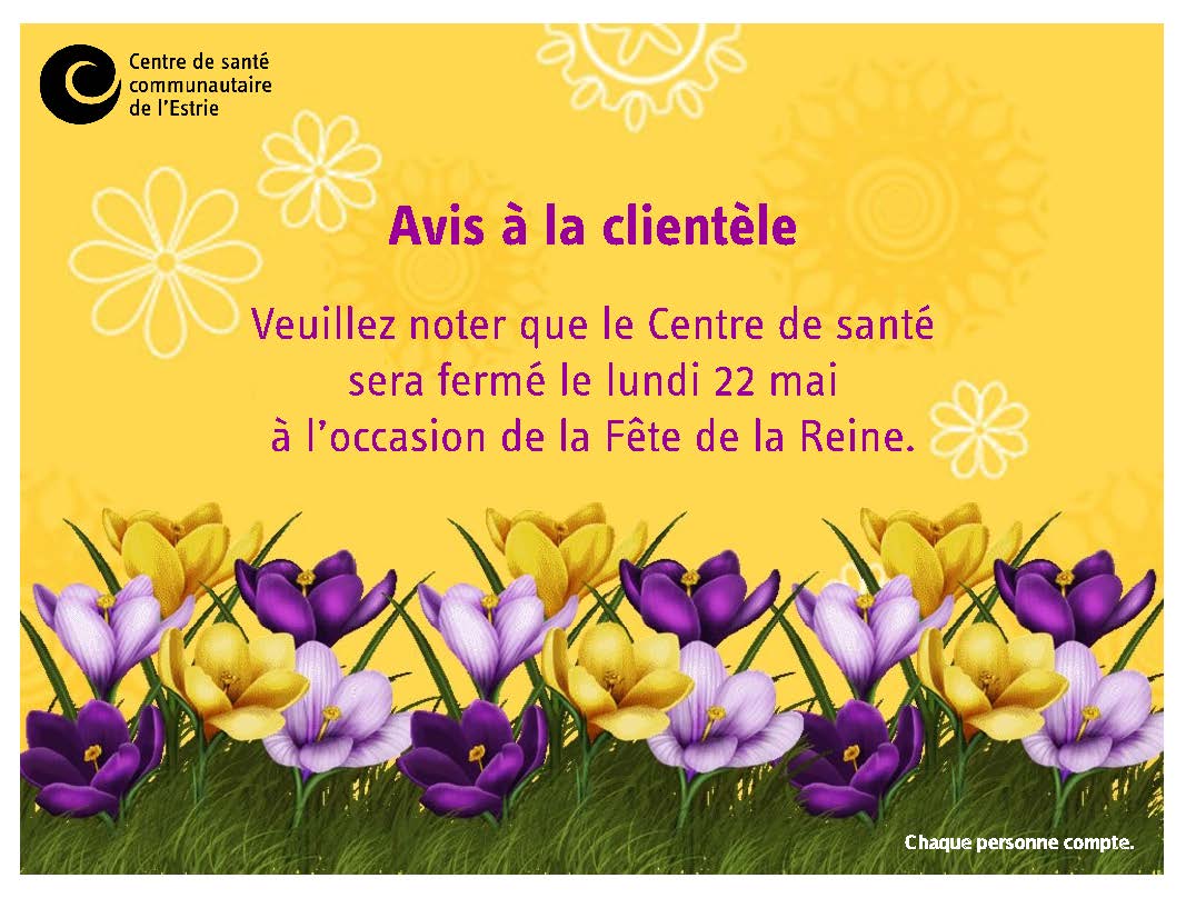 Veuillez noter que le Centre de santé sera fermé le lundi 22 mai.